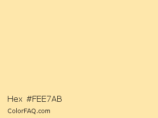 Hex #fee7ab Color is a very light orange color and the nearest color is Cape Honey #fee5ac. Hex code #fee7ab and RGB value is rgb(254,231,171). In RGB color space, this color is composed of 100% red, 91% green, 67% blue, In CMYK color space, this color is composed of 0% cyan, 9% magenta, 33% yellow , 0% black , In HSL color space, this color has a hue angle of 43° , 98% saturation and 83% lightness.