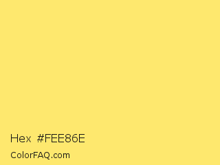 Hex #fee86e Color is a light yellow color and the nearest color is Marigold Yellow #fbe870. Hex code #fee86e and RGB value is rgb(254,232,110). In RGB color space, this color is composed of 100% red, 91% green, 43% blue, In CMYK color space, this color is composed of 0% cyan, 9% magenta, 57% yellow , 0% black , In HSL color space, this color has a hue angle of 51° , 99% saturation and 71% lightness.
