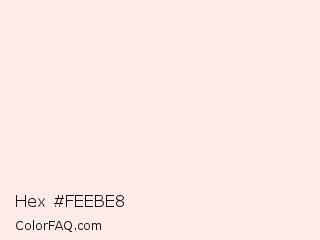 Hex #feebe8 Color is a almost white red color and the nearest color is Fair Pink #ffefec. Hex code #feebe8 and RGB value is rgb(254,235,232). In RGB color space, this color is composed of 100% red, 92% green, 91% blue, In CMYK color space, this color is composed of 0% cyan, 7% magenta, 9% yellow , 0% black , In HSL color space, this color has a hue angle of 8° , 92% saturation and 95% lightness.