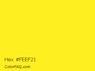 Hex #feef21 Color is a normal yellow color and the nearest color is Broom #ffec13. Hex code #feef21 and RGB value is rgb(254,239,33). In RGB color space, this color is composed of 100% red, 94% green, 13% blue, In CMYK color space, this color is composed of 0% cyan, 6% magenta, 87% yellow , 0% black , In HSL color space, this color has a hue angle of 56° , 99% saturation and 56% lightness.