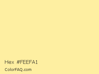 Hex #feefa1 Color is a very light yellow color and the nearest color is Vis Vis #ffefa1. Hex code #feefa1 and RGB value is rgb(254,239,161). In RGB color space, this color is composed of 100% red, 94% green, 63% blue, In CMYK color space, this color is composed of 0% cyan, 6% magenta, 37% yellow , 0% black , In HSL color space, this color has a hue angle of 50° , 98% saturation and 81% lightness.