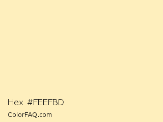 Hex #feefbd Color is a very light yellow color and the nearest color is Colonial White #ffedbc. Hex code #feefbd and RGB value is rgb(254,239,189). In RGB color space, this color is composed of 100% red, 94% green, 74% blue, In CMYK color space, this color is composed of 0% cyan, 6% magenta, 26% yellow , 0% black , In HSL color space, this color has a hue angle of 46° , 97% saturation and 87% lightness.