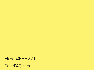 Hex #fef271 Color is a light yellow color and the nearest color is Paris Daisy #fff46e. Hex code #fef271 and RGB value is rgb(254,242,113). In RGB color space, this color is composed of 100% red, 95% green, 44% blue, In CMYK color space, this color is composed of 0% cyan, 5% magenta, 56% yellow , 0% black , In HSL color space, this color has a hue angle of 55° , 99% saturation and 72% lightness.