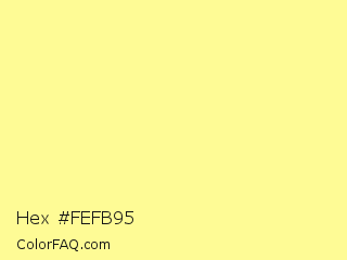 Hex #fefb95 Color is a light yellow color and the nearest color is Pastel Yellow #fdfd96. Hex code #fefb95 and RGB value is rgb(254,251,149). In RGB color space, this color is composed of 100% red, 98% green, 58% blue, In CMYK color space, this color is composed of 0% cyan, 1% magenta, 41% yellow , 0% black , In HSL color space, this color has a hue angle of 58° , 98% saturation and 79% lightness.