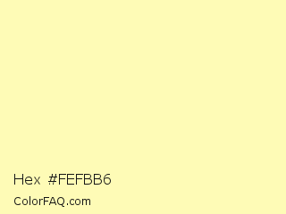 Hex #fefbb6 Color is a very light yellow color and the nearest color is Pale Prim #fdfeb8. Hex code #fefbb6 and RGB value is rgb(254,251,182). In RGB color space, this color is composed of 100% red, 98% green, 71% blue, In CMYK color space, this color is composed of 0% cyan, 1% magenta, 28% yellow , 0% black , In HSL color space, this color has a hue angle of 58° , 97% saturation and 85% lightness.