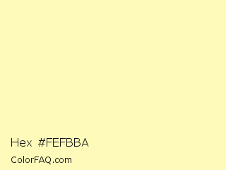 Hex #fefbba Color is a very light yellow color and the nearest color is Pale Prim #fdfeb8. Hex code #fefbba and RGB value is rgb(254,251,186). In RGB color space, this color is composed of 100% red, 98% green, 73% blue, In CMYK color space, this color is composed of 0% cyan, 1% magenta, 27% yellow , 0% black , In HSL color space, this color has a hue angle of 57° , 97% saturation and 86% lightness.
