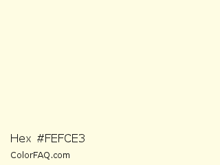 Hex #fefce3 Color is a very light yellow color and the nearest color is Off Yellow #fef9e3. Hex code #fefce3 and RGB value is rgb(254,252,227). In RGB color space, this color is composed of 100% red, 99% green, 89% blue, In CMYK color space, this color is composed of 0% cyan, 1% magenta, 11% yellow , 0% black , In HSL color space, this color has a hue angle of 56° , 93% saturation and 94% lightness.