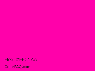 Hex #ff01aa Color is a normal magenta color and the nearest color is Hollywood Cerise #f400a1. Hex code #ff01aa and RGB value is rgb(255,1,170). In RGB color space, this color is composed of 100% red, 0% green, 67% blue, In CMYK color space, this color is composed of 0% cyan, 100% magenta, 33% yellow , 0% black , In HSL color space, this color has a hue angle of 320° , 100% saturation and 50% lightness.