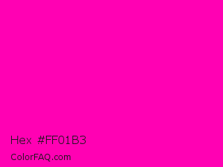 Hex #ff01b3 Color is a normal magenta color and the nearest color is Shocking Pink #fc0fc0. Hex code #ff01b3 and RGB value is rgb(255,1,179). In RGB color space, this color is composed of 100% red, 0% green, 70% blue, In CMYK color space, this color is composed of 0% cyan, 100% magenta, 30% yellow , 0% black , In HSL color space, this color has a hue angle of 318° , 100% saturation and 50% lightness.