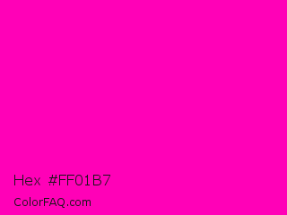 Hex #ff01b7 Color is a normal magenta color and the nearest color is Shocking Pink #fc0fc0. Hex code #ff01b7 and RGB value is rgb(255,1,183). In RGB color space, this color is composed of 100% red, 0% green, 72% blue, In CMYK color space, this color is composed of 0% cyan, 100% magenta, 28% yellow , 0% black , In HSL color space, this color has a hue angle of 317° , 100% saturation and 50% lightness.