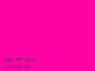 Hex #ff02a6 Color is a normal magenta color and the nearest color is Hollywood Cerise #f400a1. Hex code #ff02a6 and RGB value is rgb(255,2,166). In RGB color space, this color is composed of 100% red, 1% green, 65% blue, In CMYK color space, this color is composed of 0% cyan, 99% magenta, 35% yellow , 0% black , In HSL color space, this color has a hue angle of 321° , 100% saturation and 50% lightness.