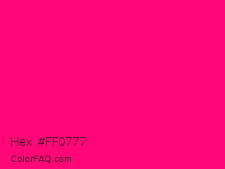 Hex #ff0777 Color is a normal rose color and the nearest color is Winter Sky #ff007c. Hex code #ff0777 and RGB value is rgb(255,7,119). In RGB color space, this color is composed of 100% red, 3% green, 47% blue, In CMYK color space, this color is composed of 0% cyan, 97% magenta, 53% yellow , 0% black , In HSL color space, this color has a hue angle of 333° , 100% saturation and 51% lightness.