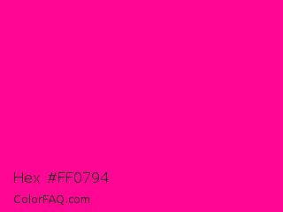 Hex #ff0794 Color is a normal magenta color and the nearest color is Magenta Process #ff0090. Hex code #ff0794 and RGB value is rgb(255,7,148). In RGB color space, this color is composed of 100% red, 3% green, 58% blue, In CMYK color space, this color is composed of 0% cyan, 97% magenta, 42% yellow , 0% black , In HSL color space, this color has a hue angle of 326° , 100% saturation and 51% lightness.