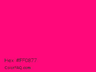 Hex #ff0877 Color is a normal rose color and the nearest color is Winter Sky #ff007c. Hex code #ff0877 and RGB value is rgb(255,8,119). In RGB color space, this color is composed of 100% red, 3% green, 47% blue, In CMYK color space, this color is composed of 0% cyan, 97% magenta, 53% yellow , 0% black , In HSL color space, this color has a hue angle of 333° , 100% saturation and 52% lightness.
