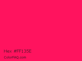 Hex #ff135e Color is a normal rose color and the nearest color is Awesome #ff2052. Hex code #ff135e and RGB value is rgb(255,19,94). In RGB color space, this color is composed of 100% red, 7% green, 37% blue, In CMYK color space, this color is composed of 0% cyan, 93% magenta, 63% yellow , 0% black , In HSL color space, this color has a hue angle of 341° , 100% saturation and 54% lightness.