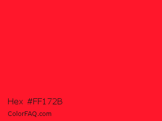 Hex #ff172b Color is a normal red color and the nearest color is Torch Red #fd0e35. Hex code #ff172b and RGB value is rgb(255,23,43). In RGB color space, this color is composed of 100% red, 9% green, 17% blue, In CMYK color space, this color is composed of 0% cyan, 91% magenta, 83% yellow , 0% black , In HSL color space, this color has a hue angle of 355° , 100% saturation and 55% lightness.