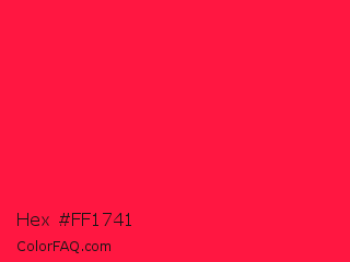 Hex #ff1741 Color is a normal red color and the nearest color is Torch Red #fd0e35. Hex code #ff1741 and RGB value is rgb(255,23,65). In RGB color space, this color is composed of 100% red, 9% green, 25% blue, In CMYK color space, this color is composed of 0% cyan, 91% magenta, 75% yellow , 0% black , In HSL color space, this color has a hue angle of 349° , 100% saturation and 55% lightness.