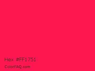 Hex #ff1751 Color is a normal red color and the nearest color is Awesome #ff2052. Hex code #ff1751 and RGB value is rgb(255,23,81). In RGB color space, this color is composed of 100% red, 9% green, 32% blue, In CMYK color space, this color is composed of 0% cyan, 91% magenta, 68% yellow , 0% black , In HSL color space, this color has a hue angle of 345° , 100% saturation and 55% lightness.