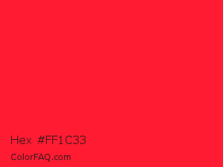 Hex #ff1c33 Color is a normal red color and the nearest color is Torch Red #fd0e35. Hex code #ff1c33 and RGB value is rgb(255,28,51). In RGB color space, this color is composed of 100% red, 11% green, 20% blue, In CMYK color space, this color is composed of 0% cyan, 89% magenta, 80% yellow , 0% black , In HSL color space, this color has a hue angle of 354° , 100% saturation and 55% lightness.
