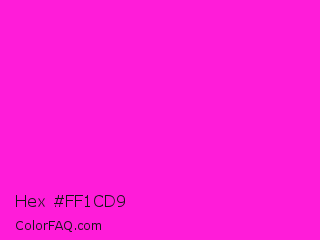 Hex #ff1cd9 Color is a normal magenta color and the nearest color is Hot Magenta #ff1dce. Hex code #ff1cd9 and RGB value is rgb(255,28,217). In RGB color space, this color is composed of 100% red, 11% green, 85% blue, In CMYK color space, this color is composed of 0% cyan, 89% magenta, 15% yellow , 0% black , In HSL color space, this color has a hue angle of 310° , 100% saturation and 55% lightness.