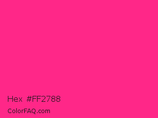 Hex #ff2788 Color is a normal rose color and the nearest color is Wild Strawberry Crayola #ff3399. Hex code #ff2788 and RGB value is rgb(255,39,136). In RGB color space, this color is composed of 100% red, 15% green, 53% blue, In CMYK color space, this color is composed of 0% cyan, 85% magenta, 47% yellow , 0% black , In HSL color space, this color has a hue angle of 333° , 100% saturation and 58% lightness.