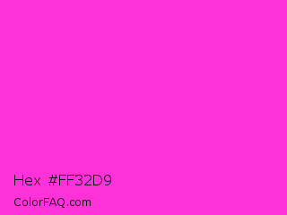 Hex #ff32d9 Color is a normal magenta color and the nearest color is Razzle Dazzle Rose #ff33cc. Hex code #ff32d9 and RGB value is rgb(255,50,217). In RGB color space, this color is composed of 100% red, 20% green, 85% blue, In CMYK color space, this color is composed of 0% cyan, 80% magenta, 15% yellow , 0% black , In HSL color space, this color has a hue angle of 311° , 100% saturation and 60% lightness.
