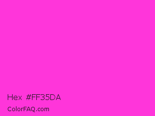 Hex #ff35da Color is a normal magenta color and the nearest color is Razzle Dazzle Rose #ff33cc. Hex code #ff35da and RGB value is rgb(255,53,218). In RGB color space, this color is composed of 100% red, 21% green, 85% blue, In CMYK color space, this color is composed of 0% cyan, 79% magenta, 15% yellow , 0% black , In HSL color space, this color has a hue angle of 311° , 100% saturation and 60% lightness.