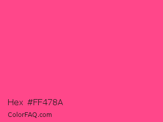 Hex #ff478a Color is a light rose color and the nearest color is Violet Red #f7468a. Hex code #ff478a and RGB value is rgb(255,71,138). In RGB color space, this color is composed of 100% red, 28% green, 54% blue, In CMYK color space, this color is composed of 0% cyan, 72% magenta, 46% yellow , 0% black , In HSL color space, this color has a hue angle of 338° , 100% saturation and 64% lightness.