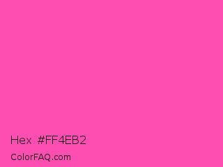 Hex #ff4eb2 Color is a light magenta color and the nearest color is Brilliant Rose #f653a6. Hex code #ff4eb2 and RGB value is rgb(255,78,178). In RGB color space, this color is composed of 100% red, 31% green, 70% blue, In CMYK color space, this color is composed of 0% cyan, 69% magenta, 30% yellow , 0% black , In HSL color space, this color has a hue angle of 326° , 100% saturation and 65% lightness.