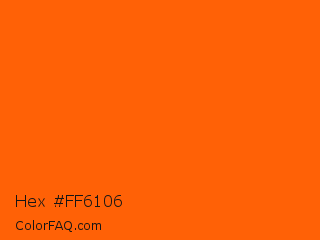 Hex #ff6106 Color is a normal orange color and the nearest color is Vivid Orange #ff5f00. Hex code #ff6106 and RGB value is rgb(255,97,6). In RGB color space, this color is composed of 100% red, 38% green, 2% blue, In CMYK color space, this color is composed of 0% cyan, 62% magenta, 98% yellow , 0% black , In HSL color space, this color has a hue angle of 22° , 100% saturation and 51% lightness.