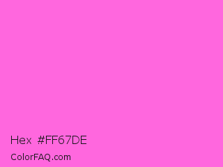 Hex #ff67de Color is a light magenta color and the nearest color is Rose Pink #ff66cc. Hex code #ff67de and RGB value is rgb(255,103,222). In RGB color space, this color is composed of 100% red, 40% green, 87% blue, In CMYK color space, this color is composed of 0% cyan, 60% magenta, 13% yellow , 0% black , In HSL color space, this color has a hue angle of 313° , 100% saturation and 70% lightness.