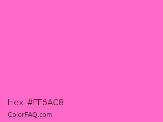 Hex #ff6ac8 Color is a light magenta color and the nearest color is Rose Pink #ff66cc. Hex code #ff6ac8 and RGB value is rgb(255,106,200). In RGB color space, this color is composed of 100% red, 42% green, 78% blue, In CMYK color space, this color is composed of 0% cyan, 58% magenta, 22% yellow , 0% black , In HSL color space, this color has a hue angle of 322° , 100% saturation and 71% lightness.