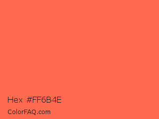 Hex #ff6b4e Color is a light red color and the nearest color is Persimmon #ff6b53. Hex code #ff6b4e and RGB value is rgb(255,107,78). In RGB color space, this color is composed of 100% red, 42% green, 31% blue, In CMYK color space, this color is composed of 0% cyan, 58% magenta, 69% yellow , 0% black , In HSL color space, this color has a hue angle of 10° , 100% saturation and 65% lightness.