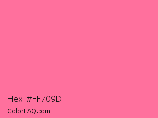 Hex #ff709d Color is a light rose color and the nearest color is French Pink #fd6c9e. Hex code #ff709d and RGB value is rgb(255,112,157). In RGB color space, this color is composed of 100% red, 44% green, 62% blue, In CMYK color space, this color is composed of 0% cyan, 56% magenta, 38% yellow , 0% black , In HSL color space, this color has a hue angle of 341° , 100% saturation and 72% lightness.
