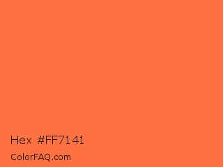 Hex #ff7141 Color is a light color and the nearest color is Smashed Pumpkin #ff6d3a. Hex code #ff7141 and RGB value is rgb(255,113,65). In RGB color space, this color is composed of 100% red, 44% green, 25% blue, In CMYK color space, this color is composed of 0% cyan, 56% magenta, 75% yellow , 0% black , In HSL color space, this color has a hue angle of 15° , 100% saturation and 63% lightness.