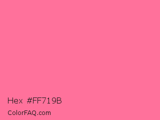 Hex #ff719b Color is a light rose color and the nearest color is French Pink #fd6c9e. Hex code #ff719b and RGB value is rgb(255,113,155). In RGB color space, this color is composed of 100% red, 44% green, 61% blue, In CMYK color space, this color is composed of 0% cyan, 56% magenta, 39% yellow , 0% black , In HSL color space, this color has a hue angle of 342° , 100% saturation and 72% lightness.