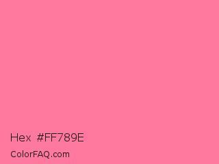 Hex #ff789e Color is a light rose color and the nearest color is Tickle Me Pink Crayola #fc80a5. Hex code #ff789e and RGB value is rgb(255,120,158). In RGB color space, this color is composed of 100% red, 47% green, 62% blue, In CMYK color space, this color is composed of 0% cyan, 53% magenta, 38% yellow , 0% black , In HSL color space, this color has a hue angle of 343° , 100% saturation and 74% lightness.