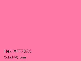 Hex #ff78a6 Color is a light rose color and the nearest color is Tickle Me Pink Crayola #fc80a5. Hex code #ff78a6 and RGB value is rgb(255,120,166). In RGB color space, this color is composed of 100% red, 47% green, 65% blue, In CMYK color space, this color is composed of 0% cyan, 53% magenta, 35% yellow , 0% black , In HSL color space, this color has a hue angle of 340° , 100% saturation and 74% lightness.