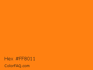 Hex #ff8011 Color is a normal orange color and the nearest color is Ecstasy #fa7814. Hex code #ff8011 and RGB value is rgb(255,128,17). In RGB color space, this color is composed of 100% red, 50% green, 7% blue, In CMYK color space, this color is composed of 0% cyan, 50% magenta, 93% yellow , 0% black , In HSL color space, this color has a hue angle of 28° , 100% saturation and 53% lightness.