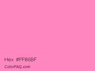 Hex #ff86bf Color is a light rose color and the nearest color is Persian Pink #f77fbe. Hex code #ff86bf and RGB value is rgb(255,134,191). In RGB color space, this color is composed of 100% red, 53% green, 75% blue, In CMYK color space, this color is composed of 0% cyan, 47% magenta, 25% yellow , 0% black , In HSL color space, this color has a hue angle of 332° , 100% saturation and 76% lightness.