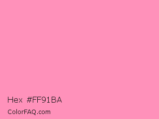 Hex #ff91ba Color is a light rose color and the nearest color is Schauss Pink #ff91af. Hex code #ff91ba and RGB value is rgb(255,145,186). In RGB color space, this color is composed of 100% red, 57% green, 73% blue, In CMYK color space, this color is composed of 0% cyan, 43% magenta, 27% yellow , 0% black , In HSL color space, this color has a hue angle of 338° , 100% saturation and 78% lightness.