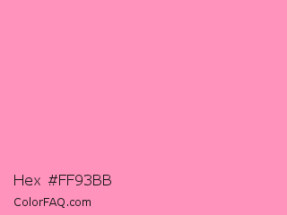 Hex #ff93bb Color is a light rose color and the nearest color is Schauss Pink #ff91af. Hex code #ff93bb and RGB value is rgb(255,147,187). In RGB color space, this color is composed of 100% red, 58% green, 73% blue, In CMYK color space, this color is composed of 0% cyan, 42% magenta, 27% yellow , 0% black , In HSL color space, this color has a hue angle of 338° , 100% saturation and 79% lightness.