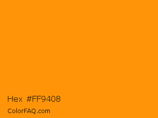 Hex #ff9408 Color is a normal orange color and the nearest color is West Side #ff910f. Hex code #ff9408 and RGB value is rgb(255,148,8). In RGB color space, this color is composed of 100% red, 58% green, 3% blue, In CMYK color space, this color is composed of 0% cyan, 42% magenta, 97% yellow , 0% black , In HSL color space, this color has a hue angle of 34° , 100% saturation and 52% lightness.