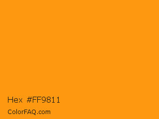 Hex #ff9811 Color is a normal orange color and the nearest color is West Side #ff910f. Hex code #ff9811 and RGB value is rgb(255,152,17). In RGB color space, this color is composed of 100% red, 60% green, 7% blue, In CMYK color space, this color is composed of 0% cyan, 40% magenta, 93% yellow , 0% black , In HSL color space, this color has a hue angle of 34° , 100% saturation and 53% lightness.