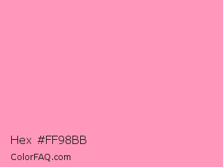 Hex #ff98bb Color is a light rose color and the nearest color is Pastel Magenta #f49ac2. Hex code #ff98bb and RGB value is rgb(255,152,187). In RGB color space, this color is composed of 100% red, 60% green, 73% blue, In CMYK color space, this color is composed of 0% cyan, 40% magenta, 27% yellow , 0% black , In HSL color space, this color has a hue angle of 340° , 100% saturation and 80% lightness.
