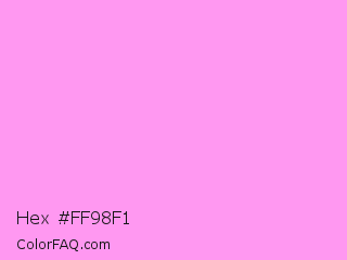 Hex #ff98f1 Color is a light magenta color and the nearest color is Lavender Rose #fba0e3. Hex code #ff98f1 and RGB value is rgb(255,152,241). In RGB color space, this color is composed of 100% red, 60% green, 95% blue, In CMYK color space, this color is composed of 0% cyan, 40% magenta, 5% yellow , 0% black , In HSL color space, this color has a hue angle of 308° , 100% saturation and 80% lightness.