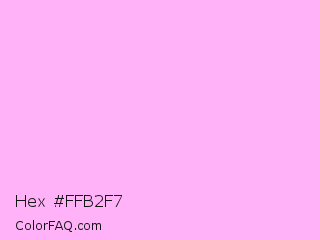 Hex #ffb2f7 Color is a very light magenta color and the nearest color is Electric Lavender #f4bbff. Hex code #ffb2f7 and RGB value is rgb(255,178,247). In RGB color space, this color is composed of 100% red, 70% green, 97% blue, In CMYK color space, this color is composed of 0% cyan, 30% magenta, 3% yellow , 0% black , In HSL color space, this color has a hue angle of 306° , 100% saturation and 85% lightness.