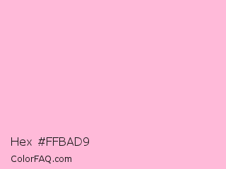 Hex #ffbad9 Color is a very light rose color and the nearest color is Cotton Candy #ffbcd9. Hex code #ffbad9 and RGB value is rgb(255,186,217). In RGB color space, this color is composed of 100% red, 73% green, 85% blue, In CMYK color space, this color is composed of 0% cyan, 27% magenta, 15% yellow , 0% black , In HSL color space, this color has a hue angle of 333° , 100% saturation and 86% lightness.
