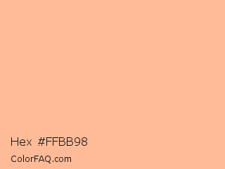 Hex #ffbb98 Color is a light orange color and the nearest color is Rose Bud #fbb2a3. Hex code #ffbb98 and RGB value is rgb(255,187,152). In RGB color space, this color is composed of 100% red, 73% green, 60% blue, In CMYK color space, this color is composed of 0% cyan, 27% magenta, 40% yellow , 0% black , In HSL color space, this color has a hue angle of 20° , 100% saturation and 80% lightness.