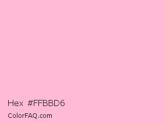 Hex #ffbbd6 Color is a very light rose color and the nearest color is Cotton Candy #ffbcd9. Hex code #ffbbd6 and RGB value is rgb(255,187,214). In RGB color space, this color is composed of 100% red, 73% green, 84% blue, In CMYK color space, this color is composed of 0% cyan, 27% magenta, 16% yellow , 0% black , In HSL color space, this color has a hue angle of 336° , 100% saturation and 87% lightness.